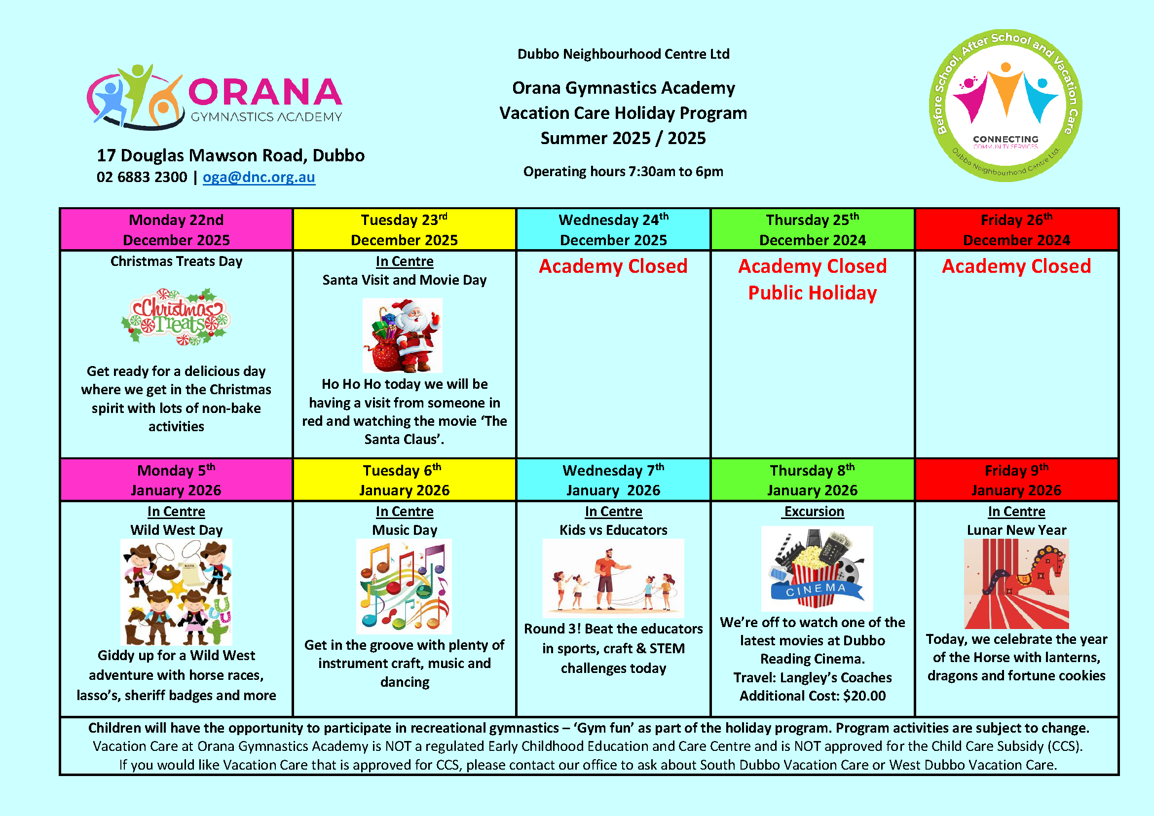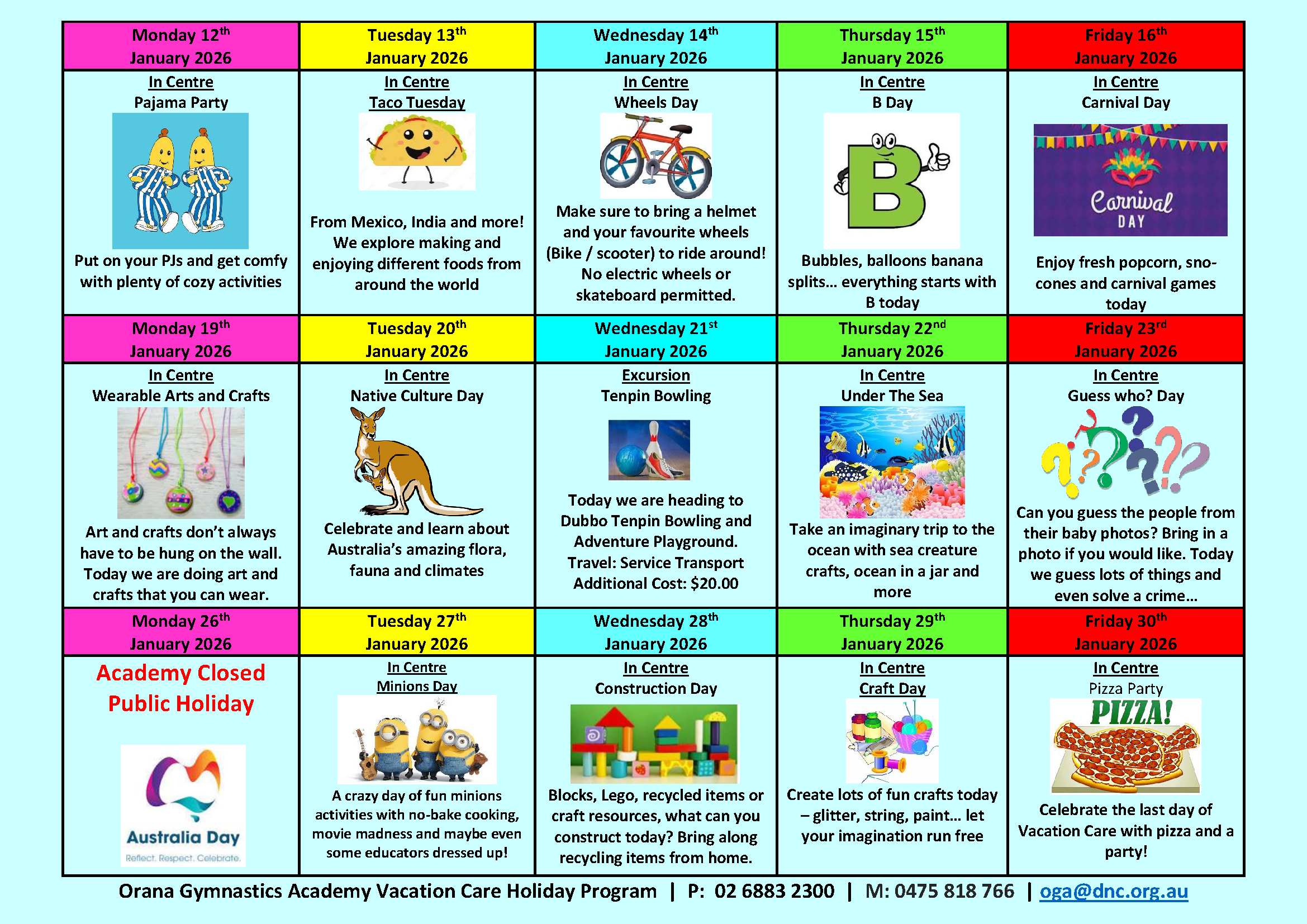 *Holiday care at Orana Gymnastics is NOT approved for the Child Care Subsidy (CCS). It you would like vacation care that is approved for CCS, please enquiry at South Dubbo Vacation Care or West Dubbo Vacation Care.